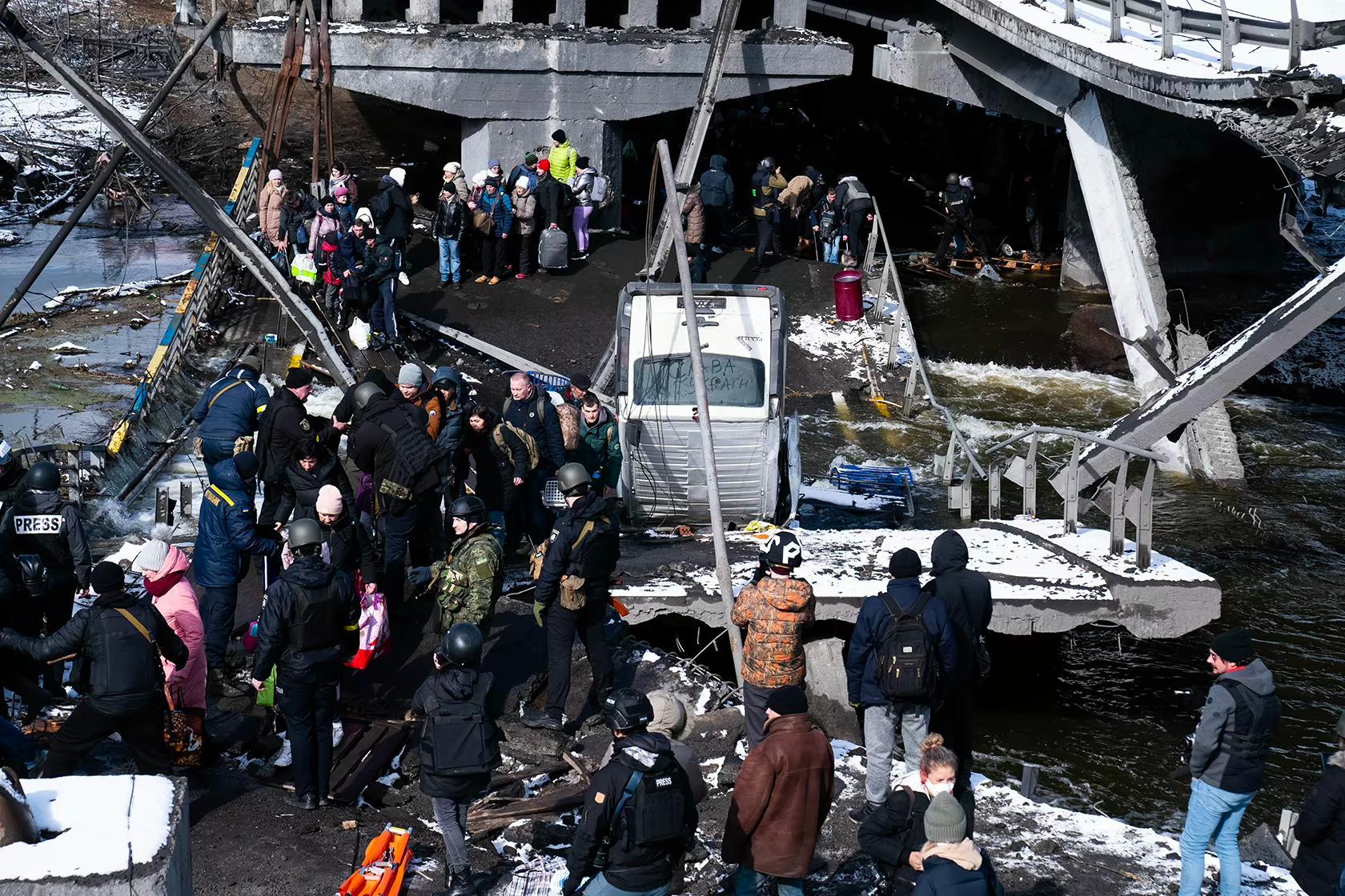 Две фотографии с разницей в полтора года. Первая – задокументировала эвакуацию из Ирпеня. В марте 2022 года через несколько дней этой дорогой смогли выбраться из-под российских обстрелов почти 40 тысяч жителей района. Фото эвакуации облетели весь мир.