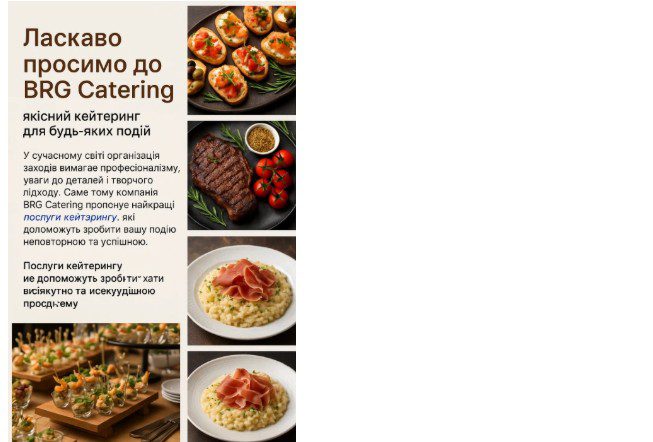 Обираючи послуги кейтерингу від BRG, ви робите ставку на бездоганну якість і комфорт.