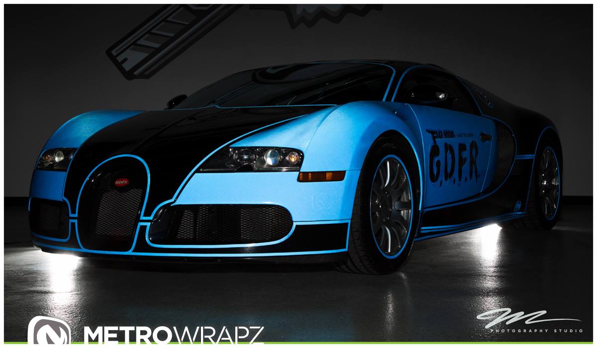 Новинка «обтянута» винилом с добавлением ярких голубых вставок, добавляющие мощному французскому автомобилю некую аналогию с известной кинолентой «Трон». Хотя как утверждает сам артист, очередное обновление Veyron он ассоциирует с выпуском своего нового трека GDFR (Going Down for Real).