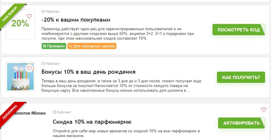 Простота использования Находить действующие промокоды в «Золотом яблоке» несложно — интернет-магазин постоянно обновляет актуальные предложения. Для удобства клиентов регулярно публикуются специальные предложения и акции. Вы можете получить скидки на косметику, парфюмерию, средства для волос, товары для здоровья и многое другое.
