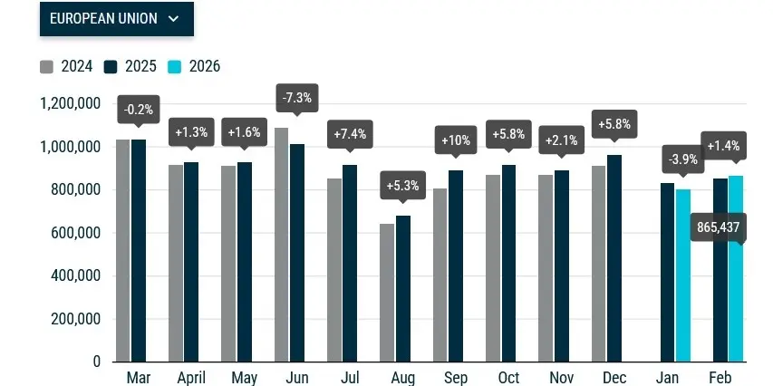 По данным АСЕА, в феврале 2026 г. Рынок новых легковых автомобилей в ЕС вырос в годовом исчислении на 1,4% — до 865,4 тыс. Ед., сообщает Укравтопром .