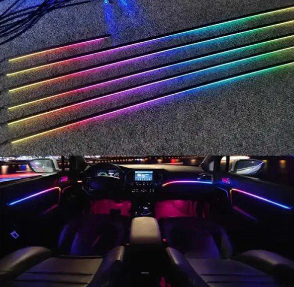 Волоконно-оптичні нитки створюють рівномірне світіння по всій довжині та ідеально підходять для складних форм салону. Вони особливо популярні для підсвічування декоративних елементів.