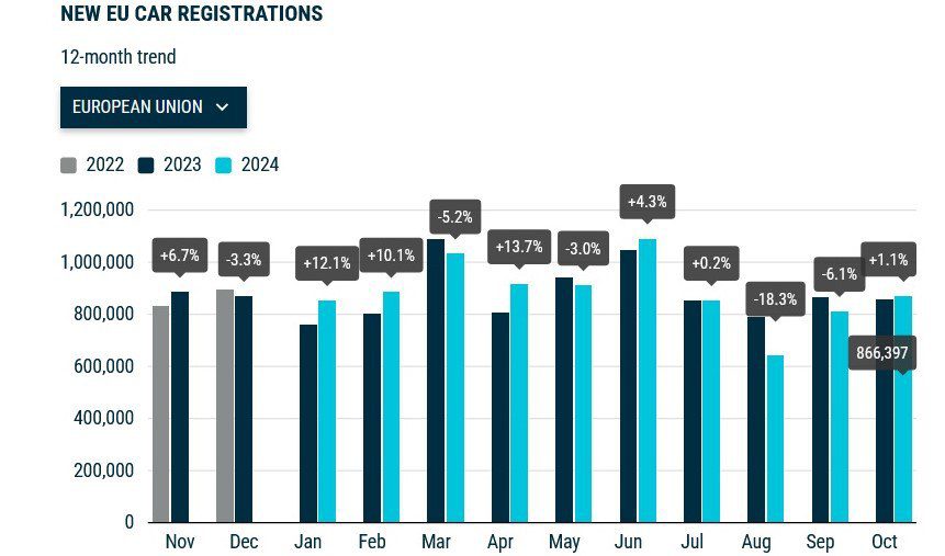 По итогам 10 месяцев 2024 г. рынок новых легковых авто в ЕС увеличился на 0,7% — до 8856195 ед.