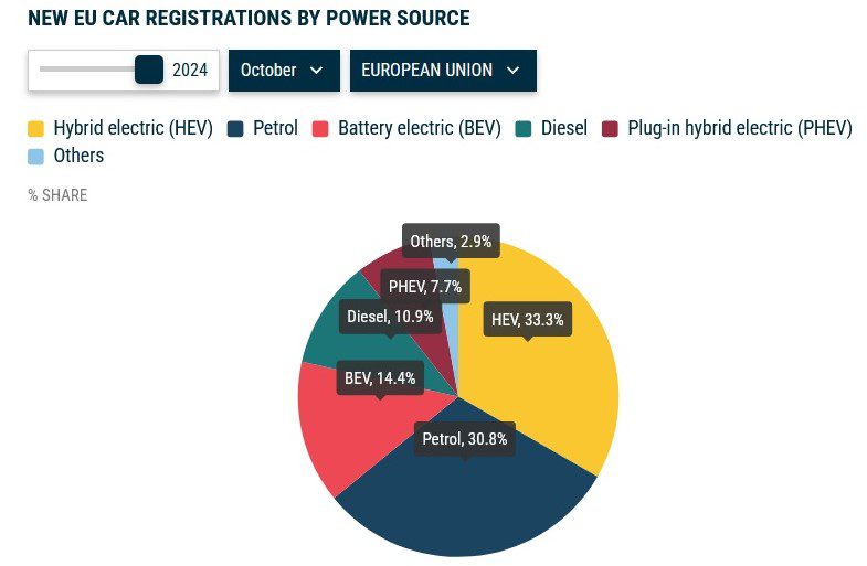 Регистрация новых автомобилей в ЕС по источнику питания: