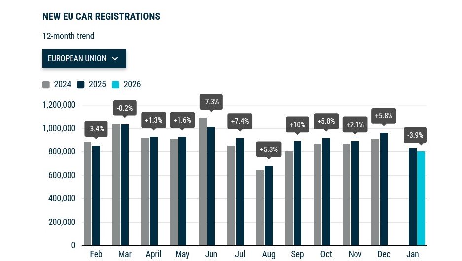 По данным АСЕА, в январе 2026 г. Рынок новых легковых автомобилей в ЕС уменьшился в годовом исчислении почти на 4% — до 799,6 тыс. Ед., сообщает Укравтопром .