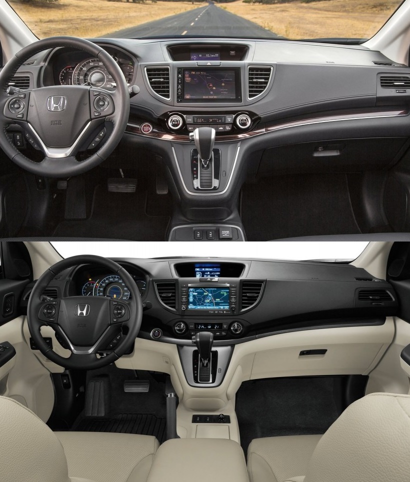 Впереди сразу заметен новый дизайн светодиодных фар и радиаторной решетки. Здесь дизайнеры приложили, пожалуй, больше усилий, чем где-либо. Внешний вид кроссовера ощутимо посвежел благодаря новой массивной панели радиатора и сотовому узору решетки, которые по задумке производителя, видимо, должны приблизить новый CR-V к современному стилю моделей Jazz и Vezel. Абсолютно новый бампер и противотуманные фары прекрасно дополняют бодрый имидж CR-V 2015 года.